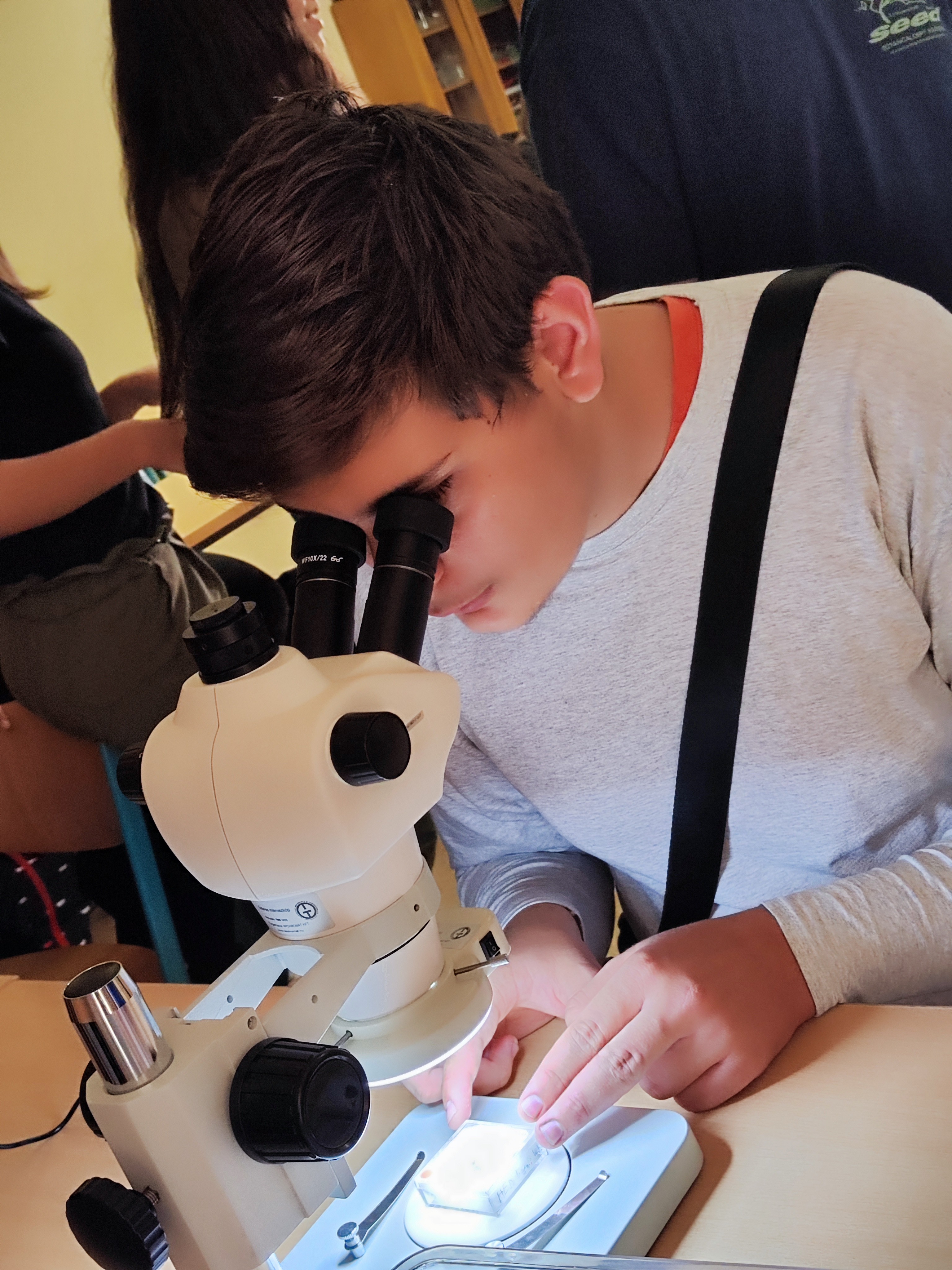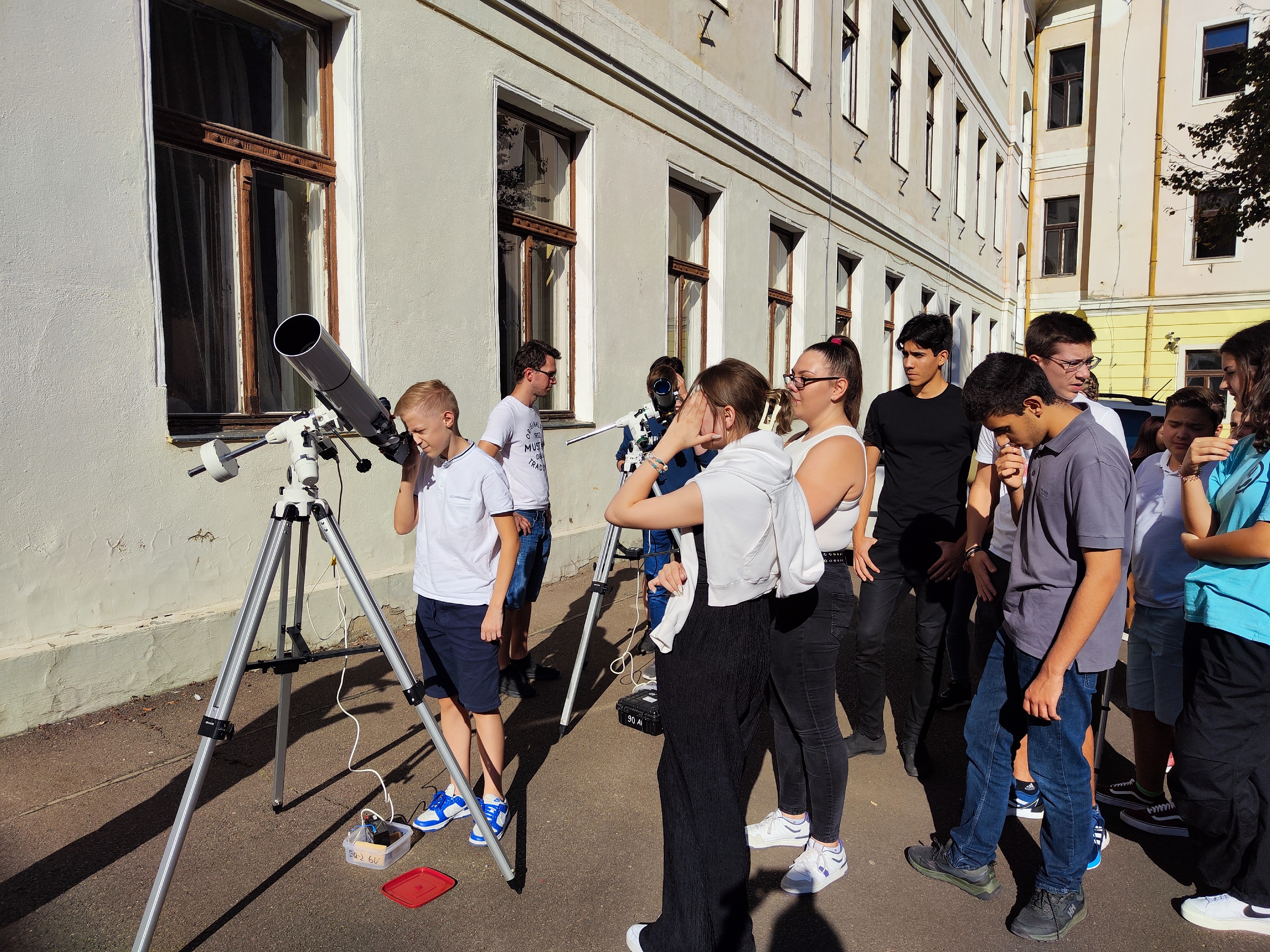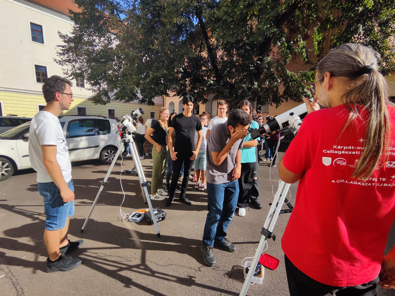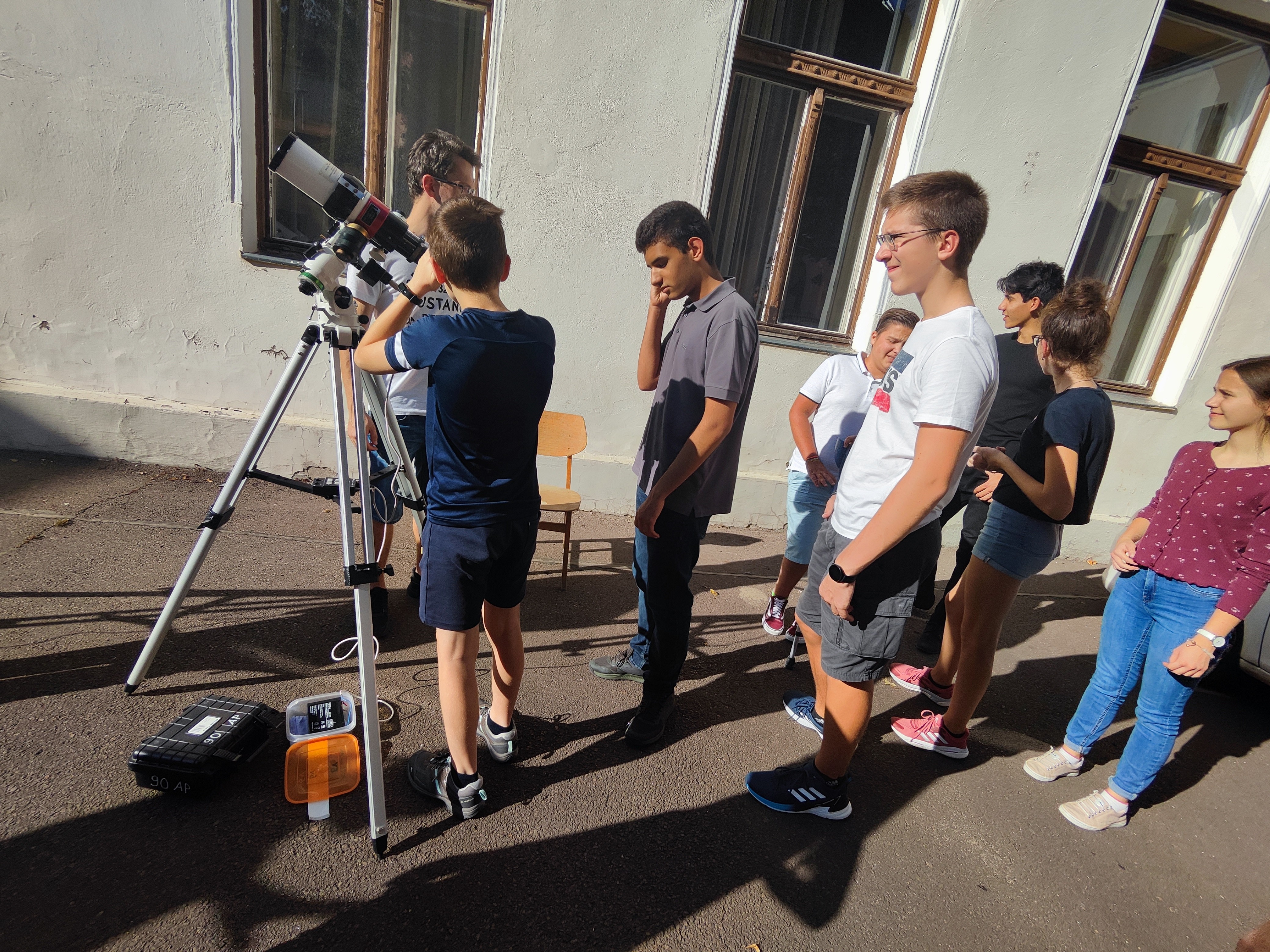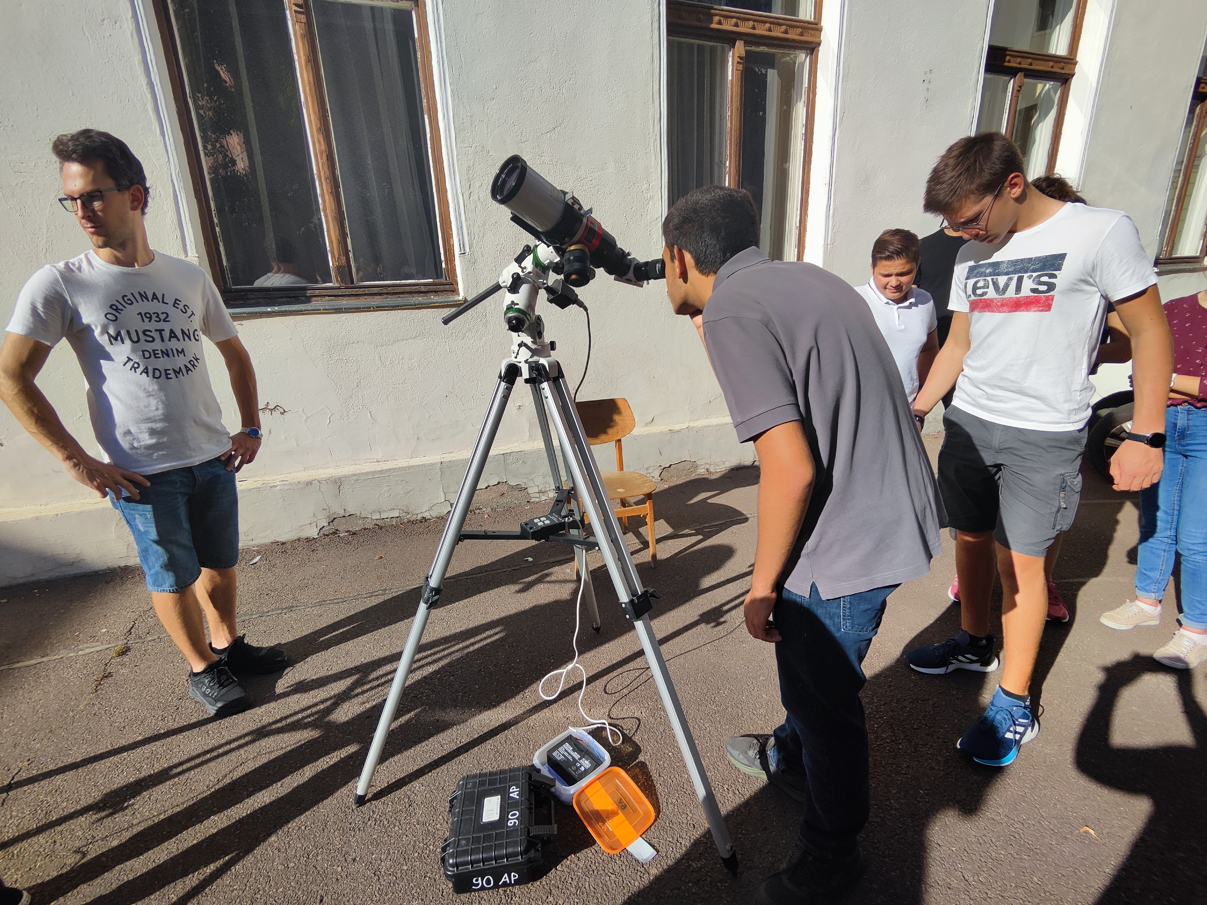 Megérkezésünk után körbevezettek bennünket az épületeten, majd az udvaron két távcsövet állítottunk fel. A lencsés távcsőnél Herschel-prizmát használtunk, amelynek köszönhetően fehér színben láttuk a központi csillagunkat. A szűrő segítségével egy tucatnyi napfoltot sikerült észlelni, amik kis apró fekete pontokként jelentek meg a csillag felszínén. Az átlagos átmérőjük 10.000-15.000 kilométerig terjed és ott a Nap felszíne csak 4500 Celsius fokos lehet. A másik távcső egy kimondottan napészlelésre létrehozott eszköz, amely H-alfa tartományban szűri a központi csillagunkból érkező fényt. Itt nem csak napfoltokat, hanem naplángokat is lehetett észlelni, amelyek több tízezer kilométer magasak is lehetnek.