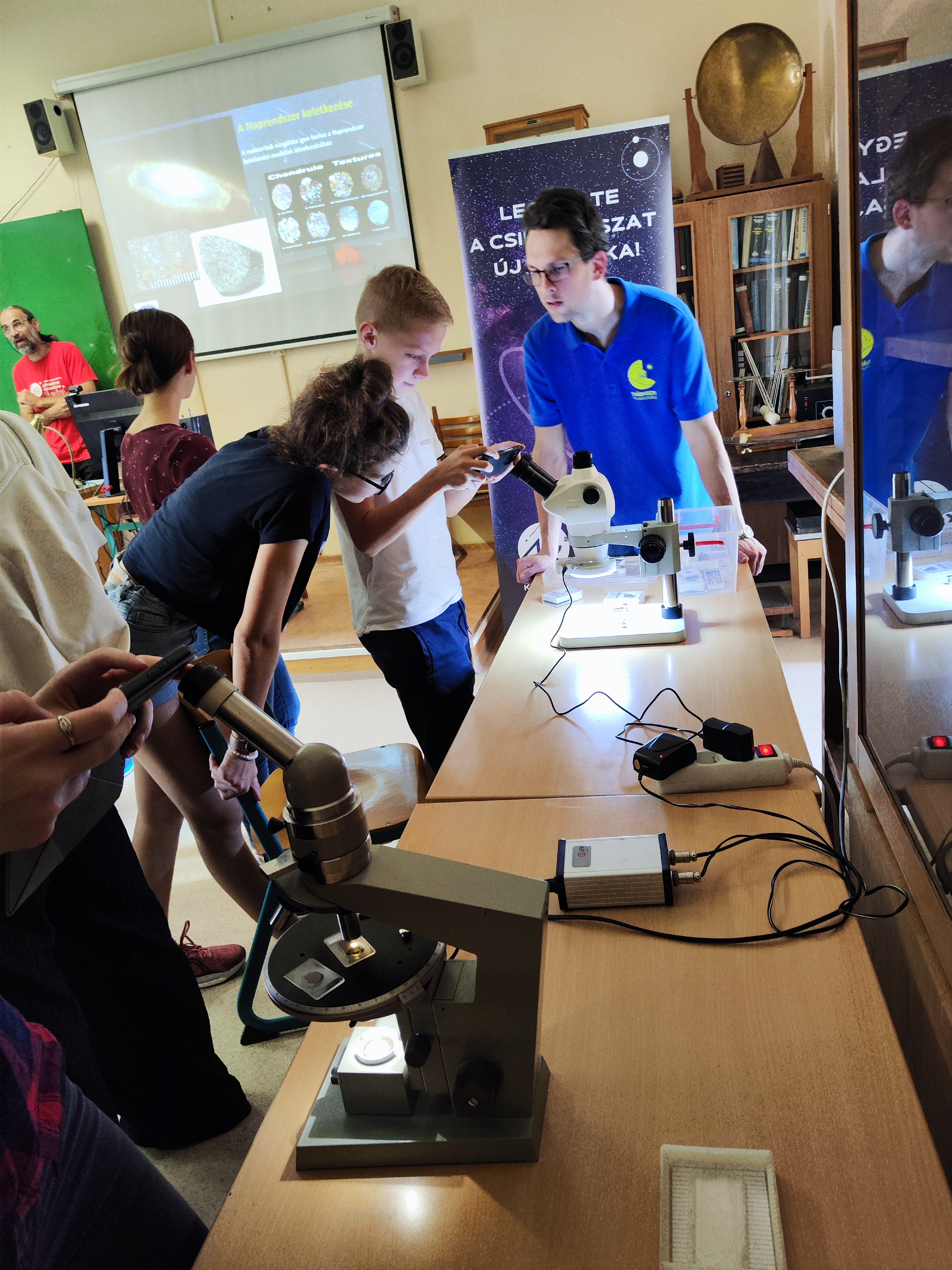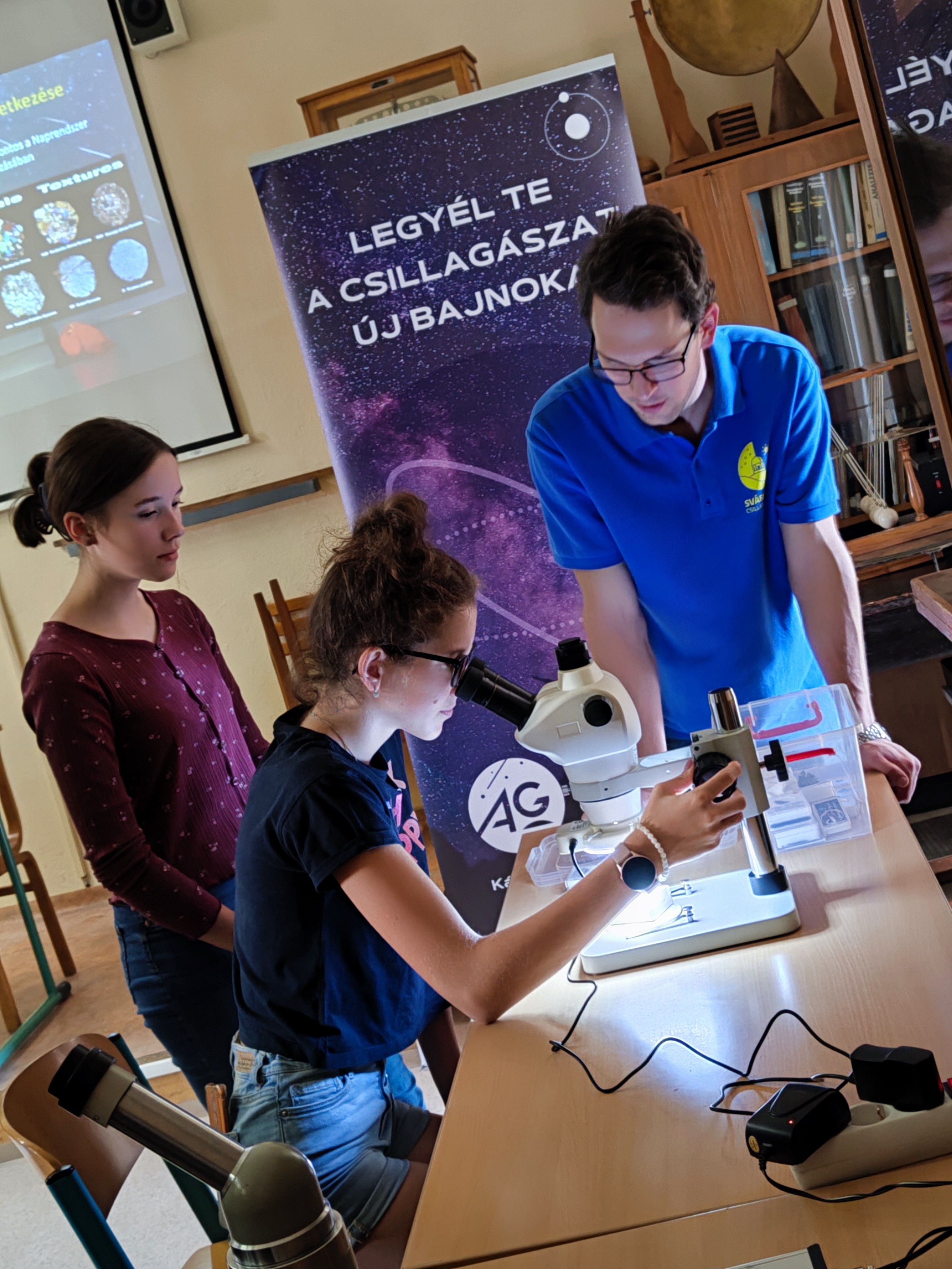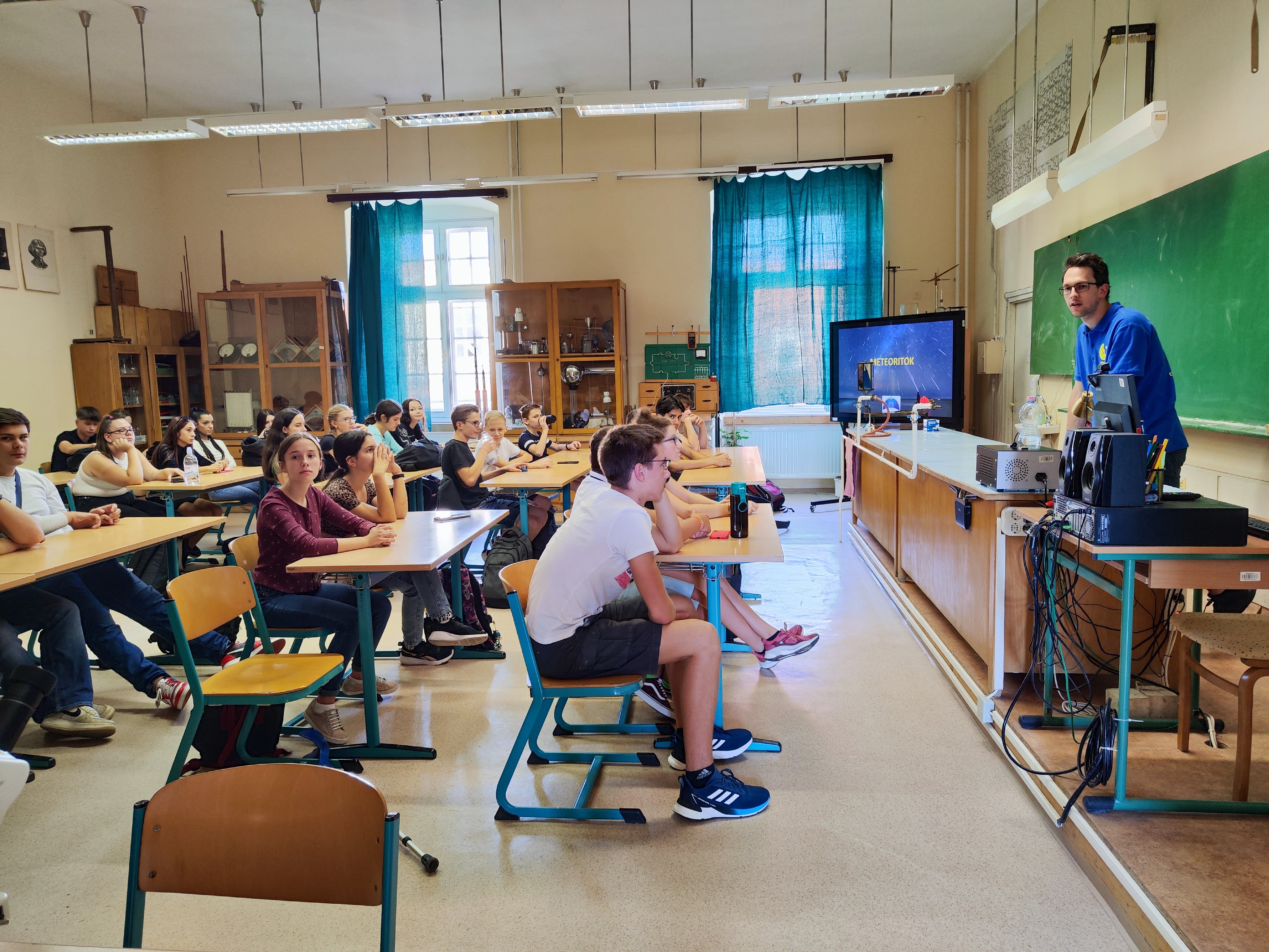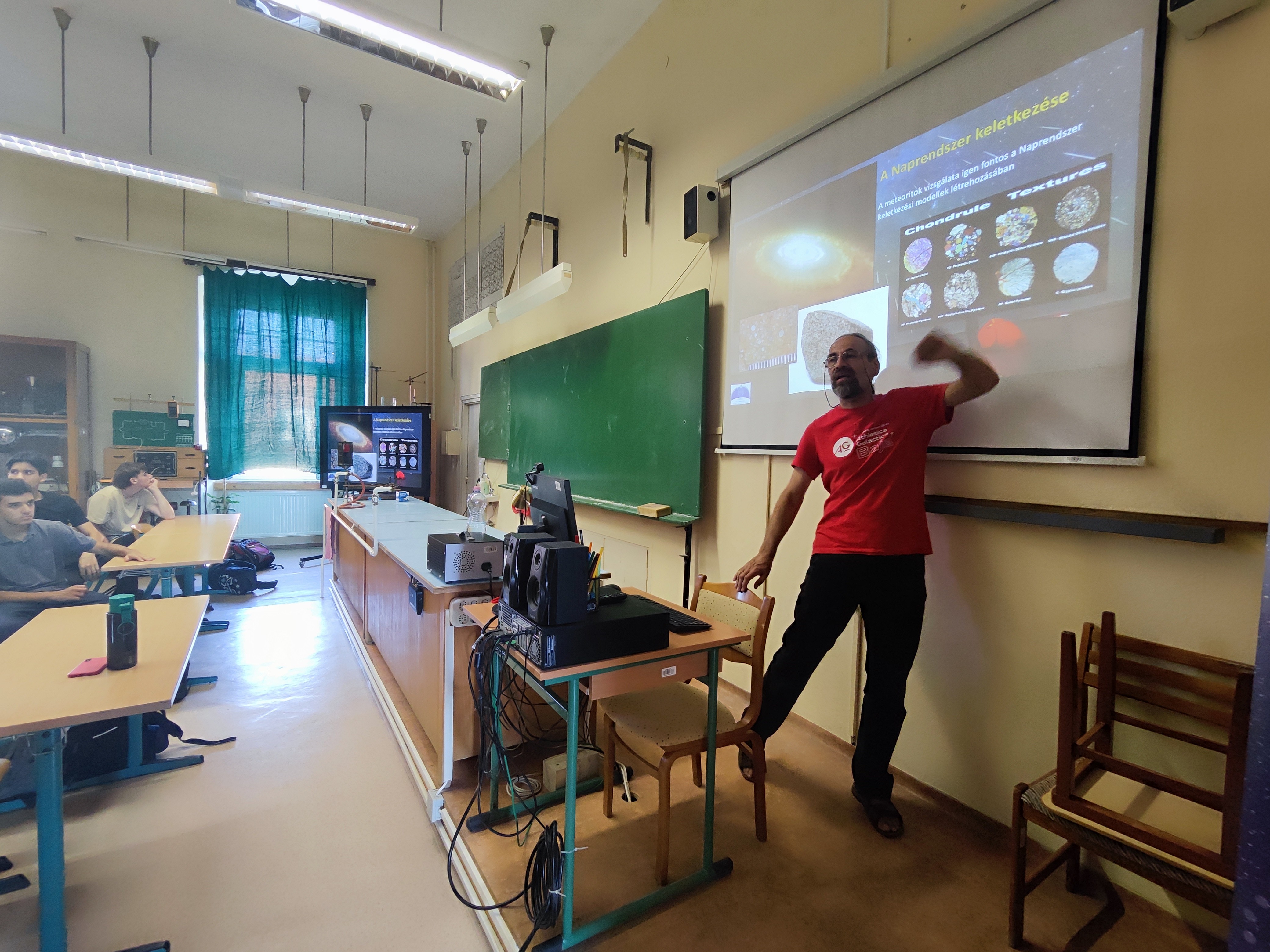 Az első előadásnál bevezettük a közönséget a meteoritok izgalmas világába. Megismerkedtek különböző csillagászati fogalmakkal és hogy mennyire fontosak a meteoritok a Naprendszer kutatásához. Szó esett jelentősebb eseményekről, mint a 2013-as cseljabinszki és körül jártuk a témát, hogy miként tudunk védekezni az űrből érkező hatalmas sziklák ellen. Ezt követően kettő mikroszkópban is meg tudták nézni a diákok és tanárok a saját szemükkel, hogy mi a különbség a vas, a kő és kővas meteoritok között. Majd a mikroszkópozás után a saját kezükben foghatták a diákok a meteoritokat. Közben a közönség számos izgalmas kérdést tett fel és a csillagászat számos témáját érintettük.