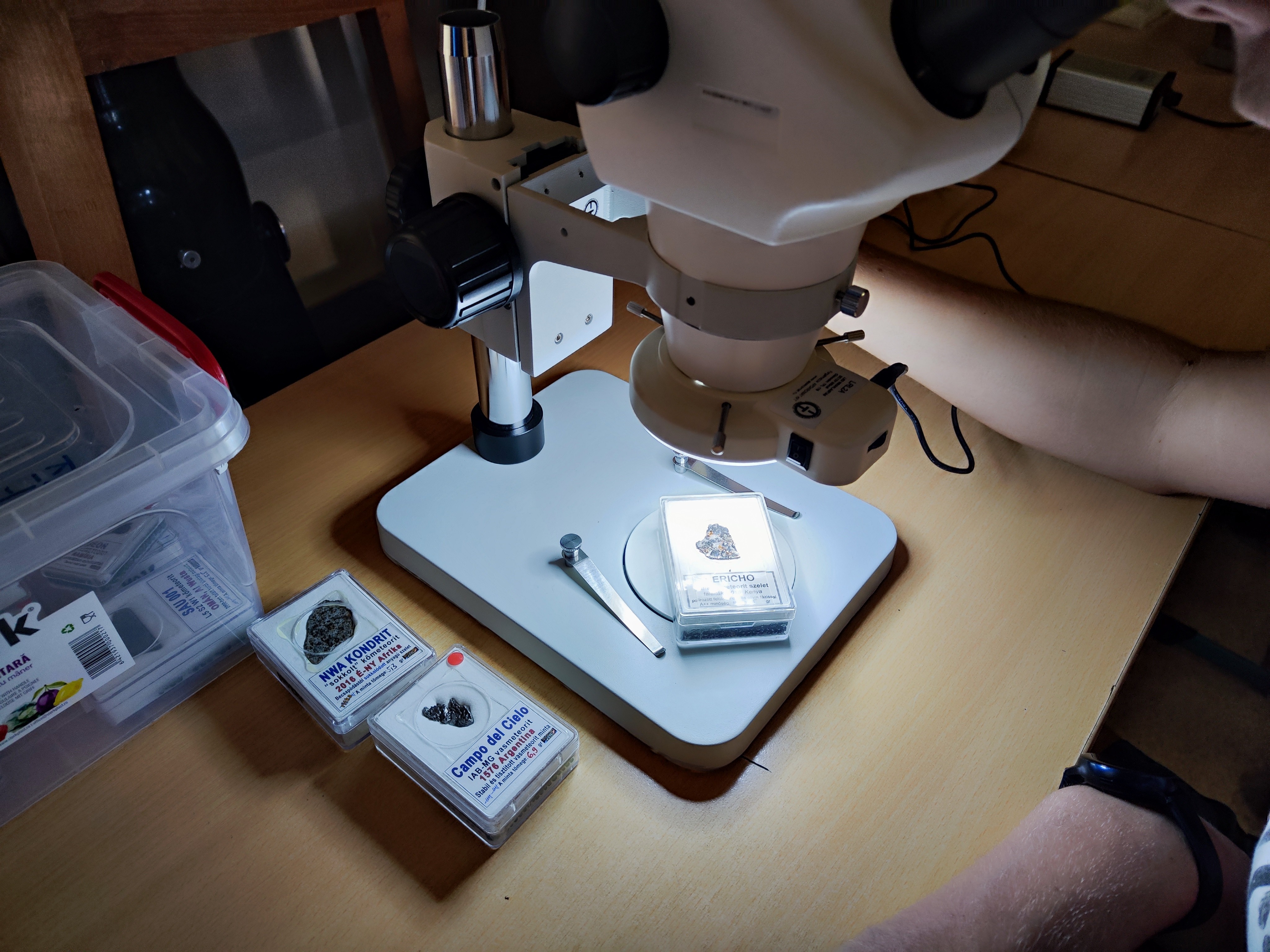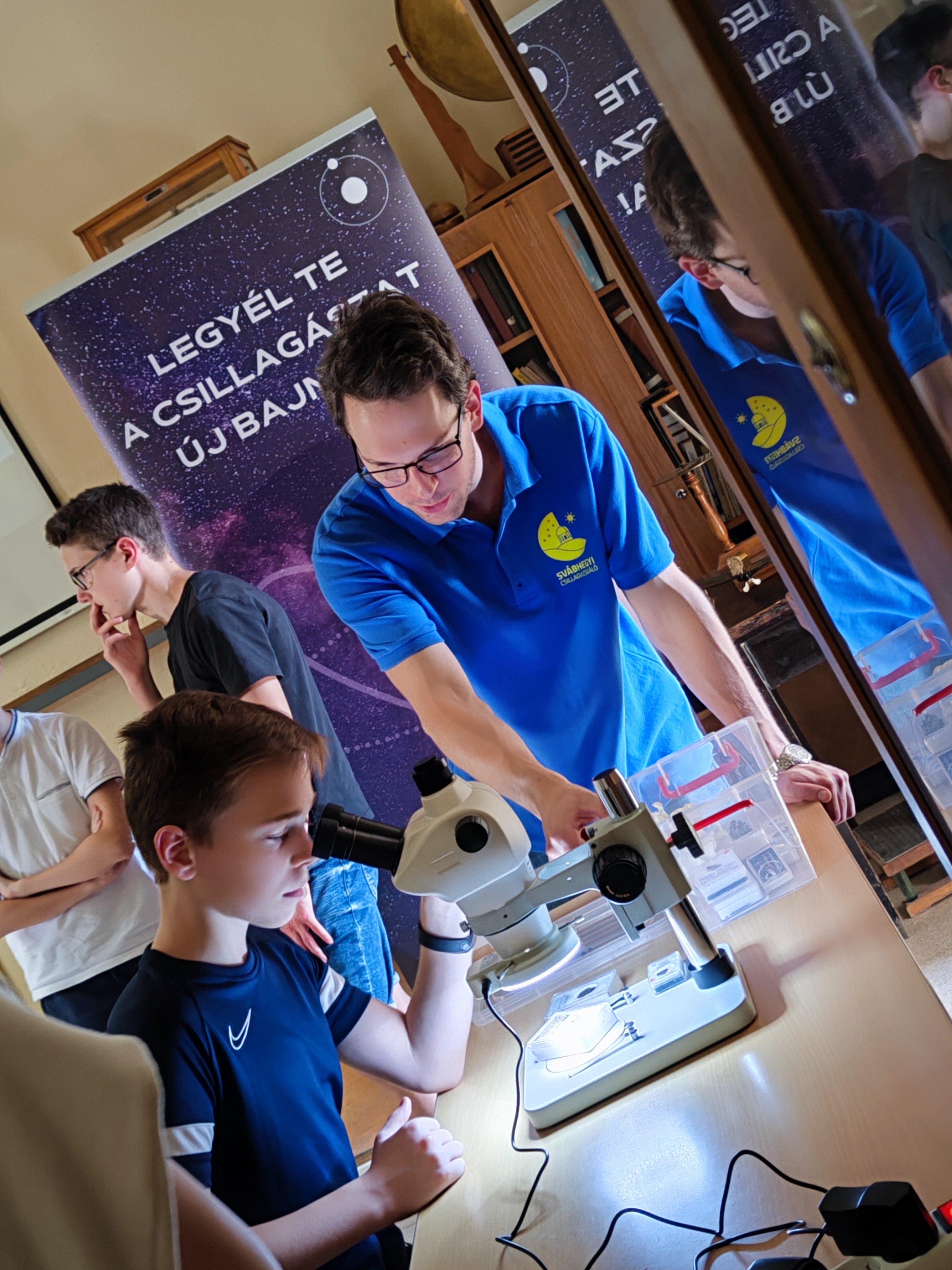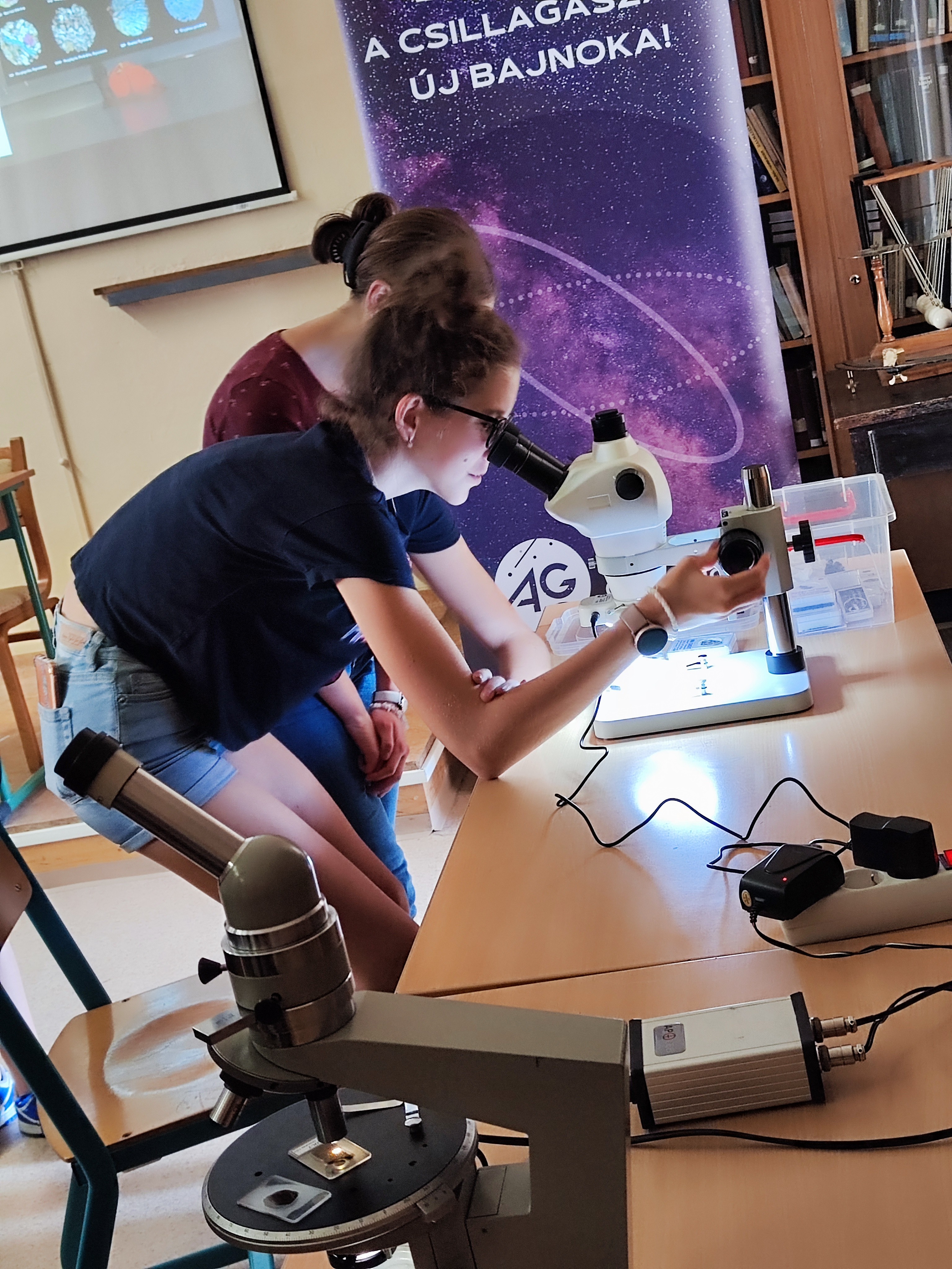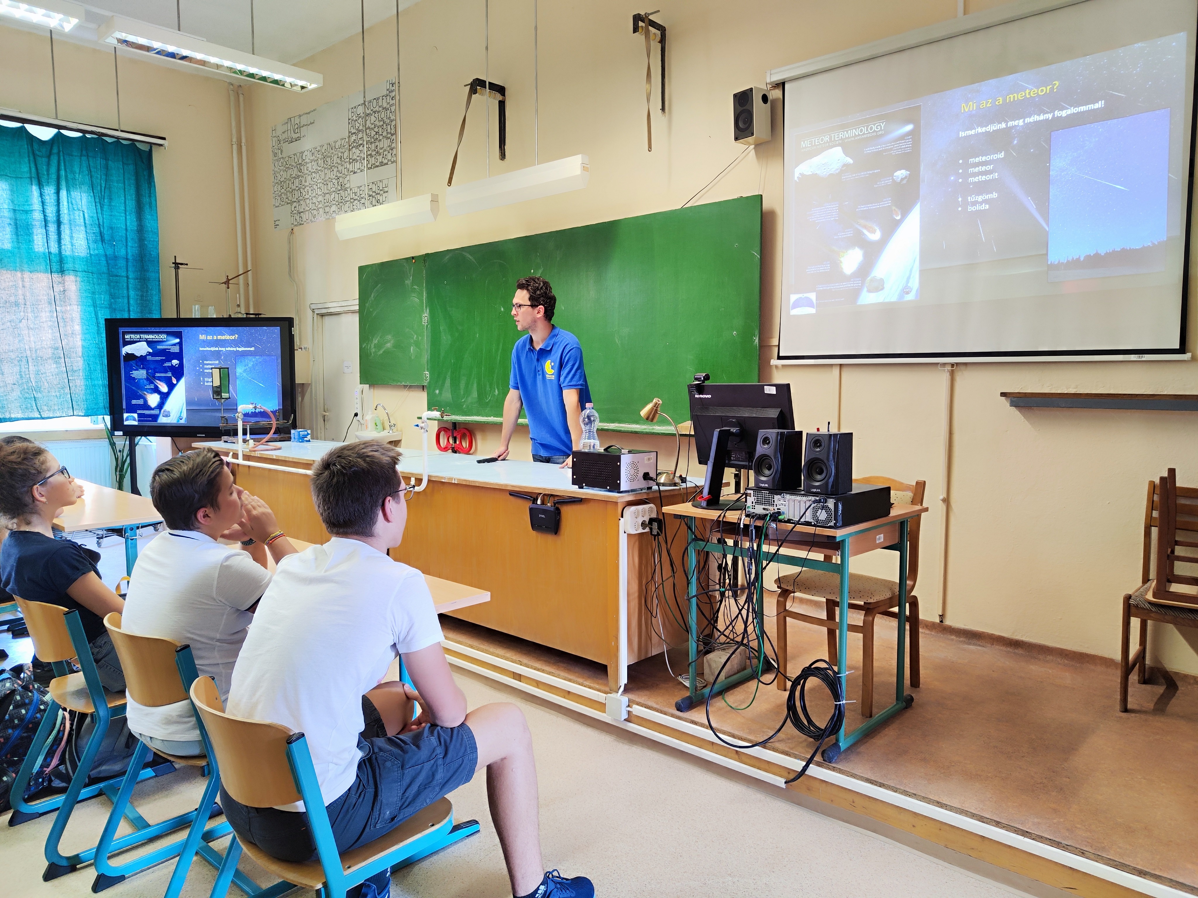 Az első előadásnál bevezettük a közönséget a meteoritok izgalmas világába. Megismerkedtek különböző csillagászati fogalmakkal és hogy mennyire fontosak a meteoritok a Naprendszer kutatásához. Szó esett jelentősebb eseményekről, mint a 2013-as cseljabinszki és körül jártuk a témát, hogy miként tudunk védekezni az űrből érkező hatalmas sziklák ellen. Ezt követően kettő mikroszkópban is meg tudták nézni a diákok és tanárok a saját szemükkel, hogy mi a különbség a vas, a kő és kővas meteoritok között. Majd a mikroszkópozás után a saját kezükben foghatták a diákok a meteoritokat. Közben a közönség számos izgalmas kérdést tett fel és a csillagászat számos témáját érintettük.